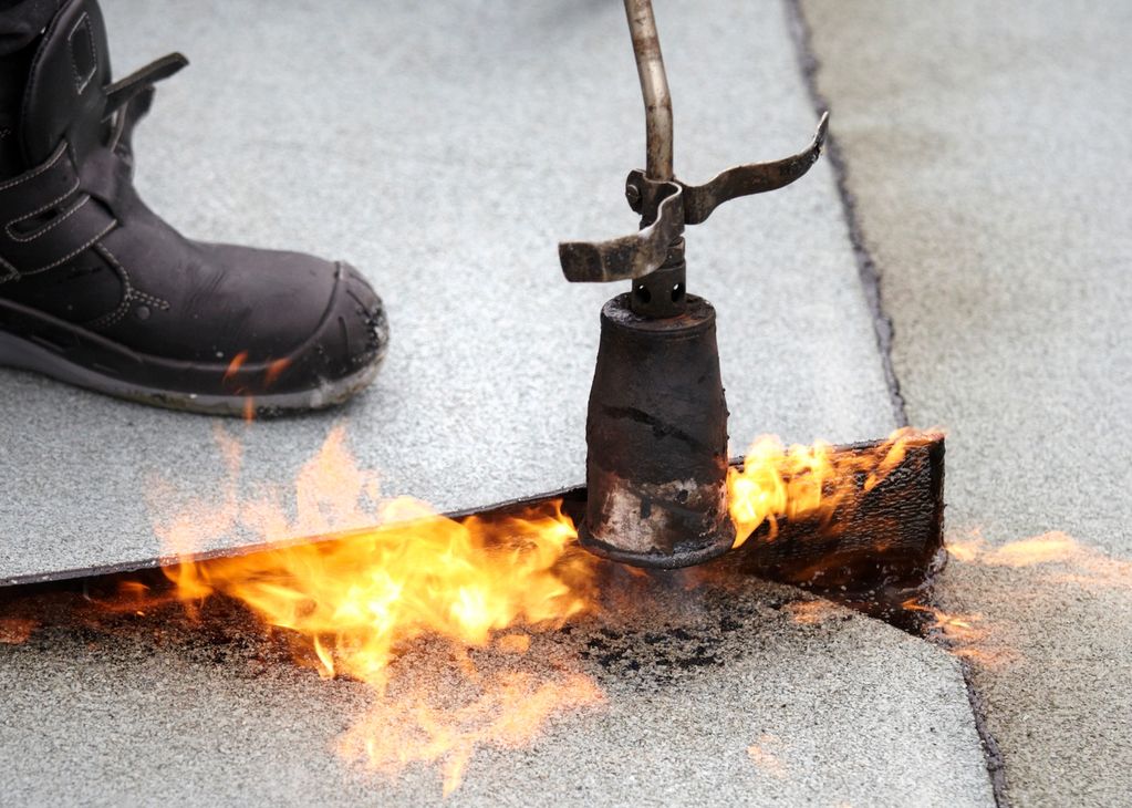 Typically used for flat or low slope roofs, where a propane torch heats the underside of the modified bitumen membrane to activate an adhesive, bonding it securely to the roof deck.